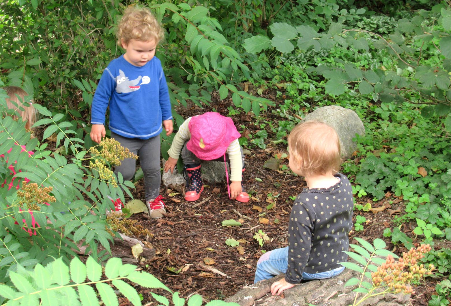 Für die Entwicklung ihrer sensomotorischen Fähigkeiten brauchen die Kinder die Erfahrung von Matsch, Sand, Blättern, Stöcken, Gebüsch, Felsen und Steinen. In der „Stöckchenschlucht”, dem „Hasengebüsch” und dem Erdspielplatz lernen die Kinder spezifische Reize und Wahrnehmungen mit bestimmten Bewegungsreaktionen zu verbinden.